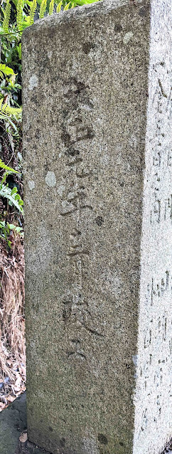 島四国25番津照寺の近くにも平田道路改修碑がある。と言っても少し山道に入るので丁寧に書いておこう。平田道路そのものが、外浦町と鏡浦町を結ぶ山道であるのだから、その山道沿いにある。かつて歩き遍路道として峠道が利用されたが、現在は海岸沿いの水軍スカイラインを通る人が大部分であろうから、そちらからの方向を示す。すなわち鏡浦港側から津照寺にお参りしたら、北側の三叉路に出て山の方へ上がっていく。程なく道は二本に分かれるので、左側の道を進む。電話線の下である。津照寺を出て、5分もしないうちに石碑が見えてくる。